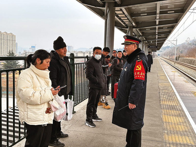 2月11日上午,佩戴著鮮紅色“黨員突擊隊(duì)”袖章的田冬功正立在站臺(tái)上耐心解答乘客的問(wèn)題。此時(shí)正值春運(yùn)返程期,商洛北站候車(chē)的群眾井然有序地經(jīng)過(guò)候車(chē)大廳的安檢處,踏上臺(tái)階,往站臺(tái)上走去。