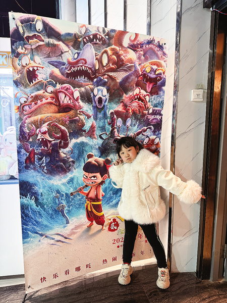 2月16日,市民楊茜帶著女兒在商洛文悅國際影城看完《哪吒之魔童鬧海》。楊茜的女兒開心地說:“過年的時候,我們已經(jīng)看過一遍了,實在太好看,所以又來看。”說完便樂呵呵地跑到影城門口的影片海報前,讓媽媽幫她拍照留念。