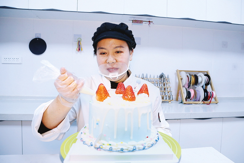 3月3日,烘焙師寇阿敏正在工作間制作顧客訂購的蛋糕??馨⒚?016年進入烘焙行業(yè),憑借著精湛手藝和獨特創(chuàng)意,做出的蛋糕、面包在朋友圈迅速走紅,她用堅持與熱愛,實現(xiàn)了從作坊到人氣店鋪的華麗轉(zhuǎn)身。