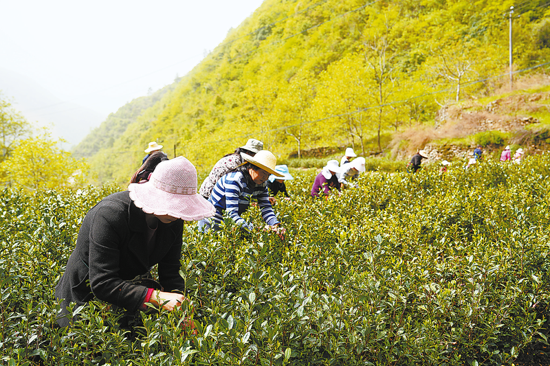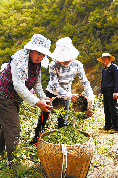4月16日,柞水縣杏坪鎮(zhèn)中臺(tái)村村民在茶園采摘茶葉。
