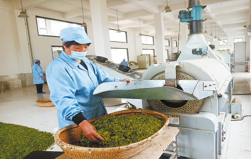 沁園春茶業(yè)有限責(zé)任公司的加工車間內(nèi),機(jī)器聲轟鳴、茶香四溢,工人正有條不紊地處理著剛剛采摘回來(lái)的春茶,經(jīng)過(guò)理?xiàng)l、殺青、烘干等一系列生產(chǎn)步驟,最終制成優(yōu)質(zhì)的茶葉。