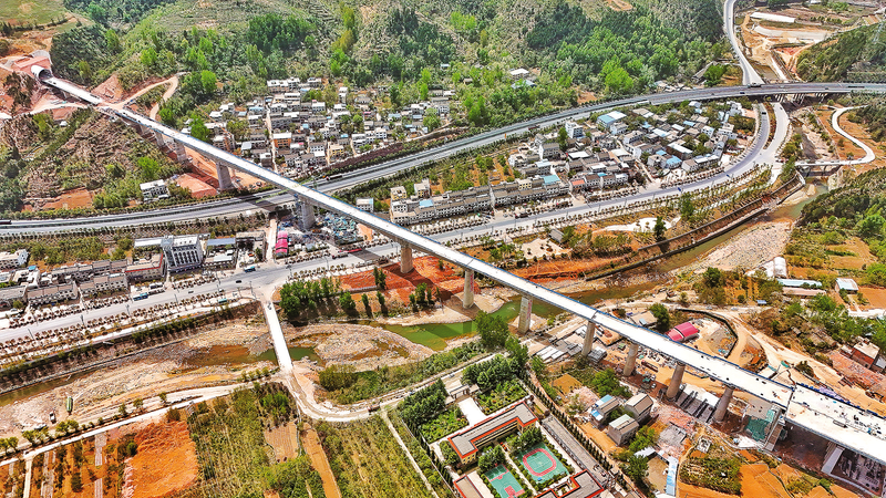 南秦河特大橋是全線唯一一座連跨道(縣、省、國道,高速公路)、河的特大橋,存在梁部各類預(yù)埋件繁多、鋼筋網(wǎng)密集和安全防護(hù)要求嚴(yán)及施工難度大等難點(diǎn),該橋于2025年1月順利完成橋梁合龍。目前,全體參建者正進(jìn)行橋梁遮板安裝工作。圖為4月16日航拍的南秦河特大橋。