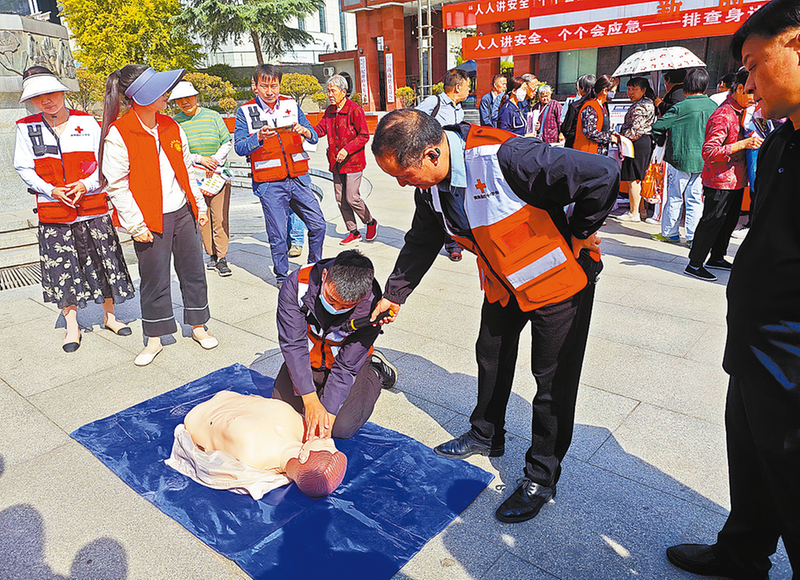 5月12日,商南縣氣象局攜手縣應(yīng)急管理局、消防救援大隊、紅十字會等安委會成員單位,在縣政府人民廣場開展“人人講安全、個個會應(yīng)急——排查身邊災(zāi)害隱患”主題集中宣傳活動。圖為紅十字會工作人員現(xiàn)場開展心臟復(fù)蘇教學(xué)。(本報通訊員 程 龍 攝)