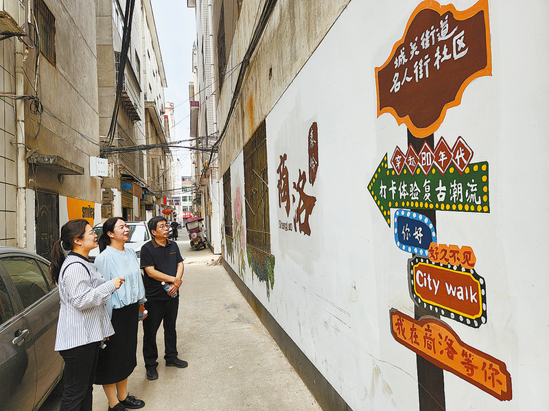 連日來,商州區(qū)城關(guān)街道名人街社區(qū)睦鄰巷內(nèi)的一組組生動活潑的“80年代縣城生活”復(fù)古墻體繪畫吸引了眾多的市民和外地游客紛紛前往打卡拍照。據(jù)介紹,這是該社區(qū)發(fā)動積極群眾參與,因地制宜,提升城市文明形象,確保城中村整治見實效的有力舉措。圖為5月14日拍攝的睦鄰巷復(fù)古繪畫墻打卡點。(本報通訊員 張紅中 攝)