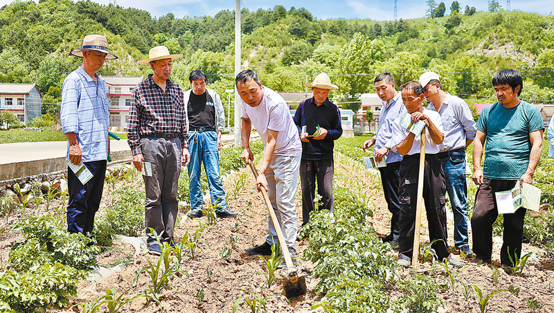 午后,在廟底村供港蔬菜基地里,洛南縣農技中心高級農藝師楊黎宏蹲在田壟間,指尖搓開一團板結的泥土:“近期天氣干旱,馬鈴薯也正是開花結薯期,一定要給充足的水分,保持土壤濕潤。”說完,他捧起一掬泥土給村民展示,“你看這塊地的濕潤度就有點低,要抓緊時間澆水……”