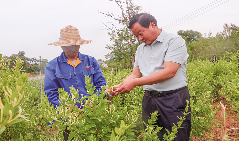 6月2日,四皓街道干部在指導(dǎo)村民采摘金銀花。當(dāng)前,四皓街道中心村的300畝金銀花喜獲豐收,村民抓住晴好天氣在田間采摘。