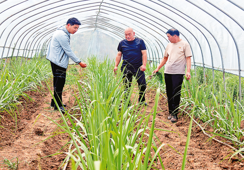 甘蔗通常是南方農(nóng)作物,對氣溫和光照要求較高,適宜在熱帶、亞熱帶地區(qū)種植。然而,去年以來,四皓街道柳樹洼村勇于探索“南蔗北種”,通過采用棚中棚、棚下膜的措施,成功攻克了甘蔗種植難題。目前,村里發(fā)展有黃皮、黑皮兩個品種的水果甘蔗30多畝。圖為5月28日,村干部在甘蔗基地查看甘蔗生長情況。