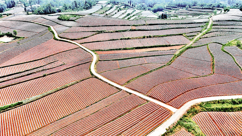 煙田育錦繡,鄉(xiāng)村美如畫。端午節(jié)前夕,走進(jìn)洛南縣四皓街道柴峪嶺,藍(lán)天白云下的成片煙田一眼望不到頭,覆蓋上地膜的煙田,在陽光照耀下熠熠生輝。記者通過無人機(jī)從空中俯瞰坡坎、梯田、坡塬,地膜似大地的指紋、似安靜的詩行、似躍動的五線譜,同勞作在田間的人們一起,繪制成一幅美麗的畫卷。