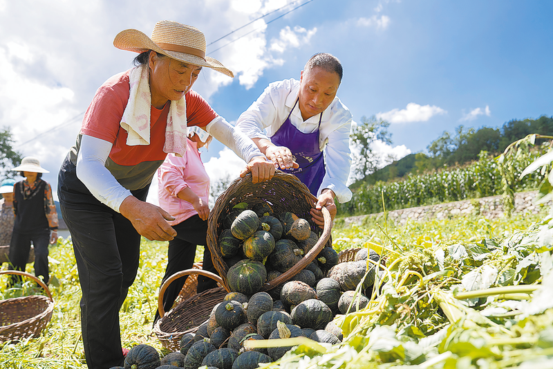 近日,洛南縣寺耳鎮(zhèn)伍仙村的貝貝南瓜成熟,田間地頭洋溢著收獲的喜悅。圖為8月20日村民熱火朝天地采摘南瓜的場(chǎng)景。 (本報(bào)通訊員 田 波 攝)