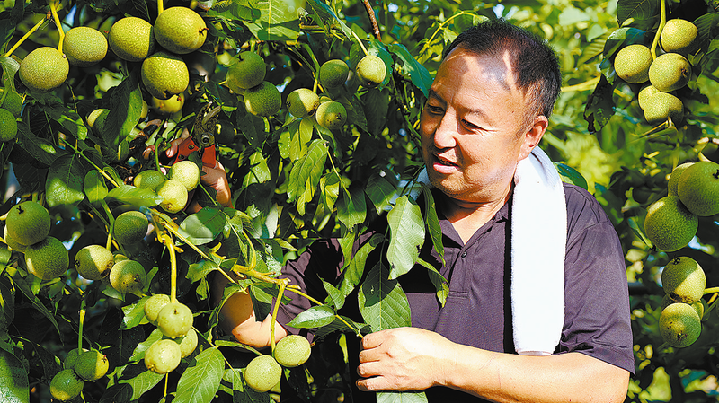 8月3日,在洛南縣景村鎮(zhèn),華陽(yáng)一升紅仁核桃專業(yè)合作社的技術(shù)人員正在檢查核桃生長(zhǎng)情況。 (本報(bào)通訊員 吳書懷 攝)