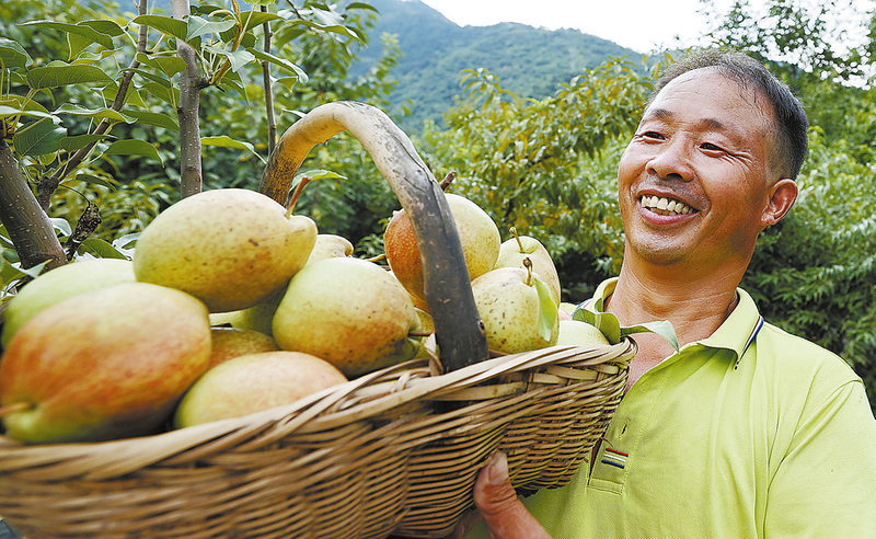 8月9日,在丹鳳縣商鎮(zhèn)王塬村,水雜果種植戶捧著剛摘的脆梨,掩不住滿臉喜悅。 (本報(bào)通訊員 阮世喜 攝)