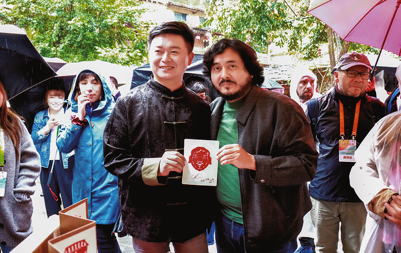 循著歌聲徐徐前行,不遠處的洛南剪紙攤前,各式各樣的臉譜鋪滿桌面,紅紙在藝人石晶的指尖翻飛,剪刀開合間,一個人物臉譜便躍然紙上。巴拿馬詩人哈維爾·阿爾瓦拉多端坐攤位前,面帶微笑,滿懷期待地盯著藝人的雙手,不一會兒,哈維爾·阿爾瓦拉的面容在紅紙上逐漸顯現(xiàn)。
