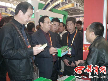 商洛市農(nóng)業(yè)局局長劉清民(左二)副局長紀栓曹(左一)在參觀第十七屆農(nóng)高會商洛展團時,向公司牛興民董事長(右一)詳細了解產(chǎn)品的研發(fā)和銷售情況