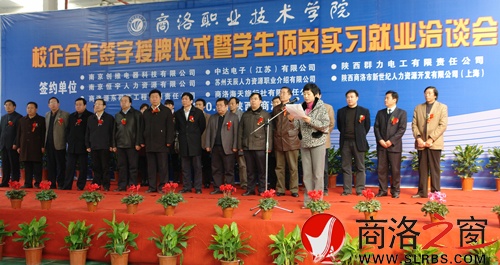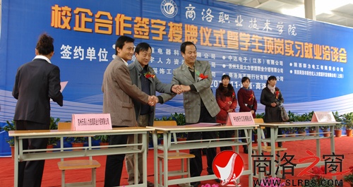 商洛職業(yè)技術(shù)學(xué)院這次和省內(nèi)外8家企業(yè)簽訂了校企合作協(xié)議。其中,中達(dá)電子(江蘇)有限公司、陜西群力電工有限責(zé)任公司、陜西商洛市新世紀(jì)人力資源開(kāi)發(fā)有限公司(上海)將成為商洛職業(yè)技術(shù)學(xué)院實(shí)習(xí)基地,蘇州天辰人力資源職業(yè)介紹所有限公司將成為商洛職業(yè)技術(shù)學(xué)院學(xué)生實(shí)習(xí)就業(yè)駐蘇州辦事處,南京恒宇人力資源有限公司為商洛職業(yè)技術(shù)學(xué)院學(xué)生實(shí)習(xí)就業(yè)駐南京辦事處,商洛源東裝飾工程有限責(zé)任公司為商洛職業(yè)技術(shù)學(xué)院藝術(shù)設(shè)計(jì)專業(yè)實(shí)習(xí)基地,商洛海天旅行社有限責(zé)任公司為商洛職業(yè)技術(shù)學(xué)院旅游管理專業(yè)實(shí)習(xí)基地,南京創(chuàng)維電器科技有限公司授予商洛職業(yè)技術(shù)學(xué)院"南京創(chuàng)維電器科技有限公司--員工培訓(xùn)基地"。
