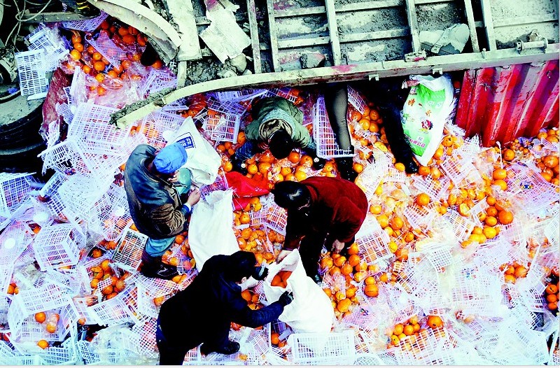 11月16日凌晨5時(shí)許,一輛江西牌照的半掛大貨車(chē)不慎翻入十多米深的河道內(nèi),車(chē)內(nèi)兩人受傷,30多噸水果散落在河道中。傷者被急救人員送往醫(yī)院后,藍(lán)田縣葛牌鎮(zhèn)鐵索橋村部分村民及附近多個(gè)村子共40多人,沖入事故現(xiàn)場(chǎng),開(kāi)始哄搶水果,有些人甚至開(kāi)來(lái)面包車(chē)、農(nóng)用三輪車(chē)、摩托車(chē)往家里轉(zhuǎn)運(yùn)水果。直到12時(shí)18分,草坪派出所民警趕到現(xiàn)場(chǎng)才將鬧劇制止,但現(xiàn)場(chǎng)的水果最多剩下不到三分之一了。