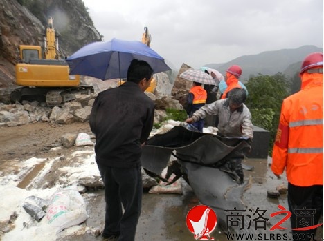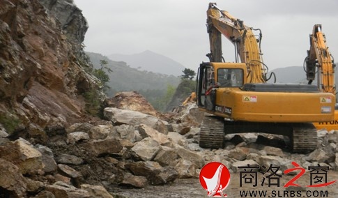 商州區(qū)麻街嶺段發(fā)生山體滑坡,大石塊橫霸路面,現(xiàn)場工作人員緊急對路面進(jìn)行搶修。