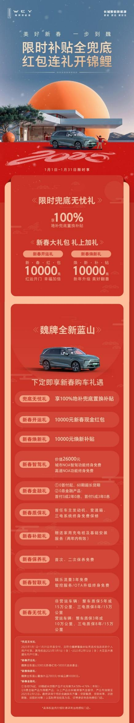 如今,新春換車季已然來(lái)臨,全新藍(lán)山限時(shí)補(bǔ)貼和紅包福利火熱開啟?,F(xiàn)在購(gòu)買魏牌全新藍(lán)山即可立享100%地補(bǔ)兜底置換補(bǔ)貼、10000元新春現(xiàn)金紅包、10000元煥新補(bǔ)貼、價(jià)值26000元城市NOA智駕功能終身免費(fèi)&高速NOA功能終身免費(fèi)、首任車主發(fā)動(dòng)機(jī)&變速箱&三電系統(tǒng)終身免費(fèi)保修、贈(zèng)送家用充電樁及基礎(chǔ)安裝服務(wù)(兩年內(nèi)有效)、首次二次保養(yǎng)免費(fèi)、娛樂流量3年免費(fèi),智控服務(wù)/OTA升級(jí)終身免費(fèi)、非營(yíng)運(yùn)車輛整車質(zhì)保5年/15萬(wàn)公里、三電質(zhì)保8年/15萬(wàn)公里、營(yíng)運(yùn)車輛整車質(zhì)保3年/10萬(wàn)公里,三電質(zhì)保8年/15萬(wàn)公里等超值購(gòu)車禮遇,同時(shí)還有首付0%起,60期超長(zhǎng)貸期和0息金融產(chǎn)品。對(duì)追求穩(wěn)健性能和智能豪華體驗(yàn)的用戶來(lái)說(shuō),現(xiàn)在正是入手全新藍(lán)山最佳時(shí)機(jī)!感興趣的朋友們,歡迎前往長(zhǎng)城智選店試駕體驗(yàn)~