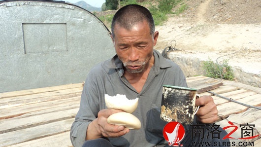 兩個(gè)饅頭,一缸子茶就是陳江富的午餐。