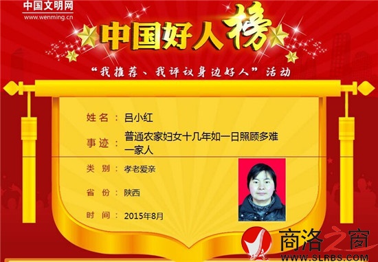 商洛之窗訊(丹南)8月31日,商南普通農(nóng)婦呂小紅榮登8月"中國好人榜",被評為孝老愛親類中國好人。