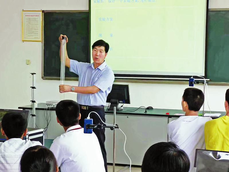 在講簡(jiǎn)諧運(yùn)動(dòng)時(shí),有描繪單擺的振動(dòng)圖像的實(shí)驗(yàn)。這個(gè)實(shí)驗(yàn),老師們?cè)谡n堂上很難現(xiàn)場(chǎng)還原,都是在理論上簡(jiǎn)單強(qiáng)調(diào)。張志鋒總能想出一些淺顯易懂的辦法,將深?yuàn)W的物理知識(shí)變得形象可感。他在乒乓球中裝入細(xì)鹽,用細(xì)線把乒乓球綁住,懸掛在鐵架臺(tái)上,讓乒乓球在擺動(dòng)時(shí)細(xì)鹽流出,再在鐵架臺(tái)下方鋪設(shè)可拉動(dòng)的紙板。當(dāng)乒乓球開(kāi)始擺動(dòng),隨即拉動(dòng)紙板,流出的細(xì)鹽就在紙板上形成振動(dòng)曲線。雖然這樣已能直觀地告訴學(xué)生單擺運(yùn)動(dòng)的規(guī)律,但張志鋒仍不滿足。2011年,學(xué)校建立了數(shù)字化探究實(shí)驗(yàn)室,他利用數(shù)字化實(shí)驗(yàn)系統(tǒng),把傳統(tǒng)實(shí)驗(yàn)與數(shù)字化實(shí)驗(yàn)結(jié)合起來(lái),在課堂上很好地完成了圖像的描繪。他把這個(gè)動(dòng)態(tài)的圖像通過(guò)多媒體大屏幕展現(xiàn)出來(lái),讓同學(xué)們既能理解到實(shí)驗(yàn)的原理,又能清晰地看到實(shí)驗(yàn)的現(xiàn)象,從而感受到了科技的魅力。
