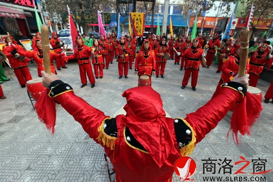 黨代會(huì)期間,商州鶴城鑼鼓隊(duì)在街頭慶賀表演。">