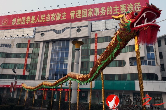 市中心廣場(chǎng),在“參加選舉是人民當(dāng)家做主、管理國(guó)家事務(wù)的主要途徑”的巨幅標(biāo)語下,一條騰飛的巨龍象征著我市龍年再創(chuàng)輝煌。(方 立 攝)