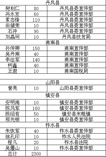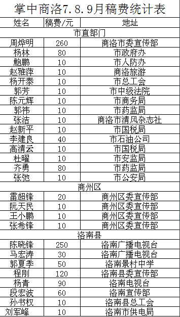 掌中商洛訊 掌中商洛自6月底上線以來,得到社會(huì)各界的廣泛關(guān)注,特別是得到廣大通訊員的大力支持。三個(gè)月來,共收到社會(huì)來稿300余篇,其中從中選用編發(fā)稿件230篇?,F(xiàn)將編發(fā)的稿件作者姓名、單位,發(fā)稿篇數(shù)等情況予以公布。請市直部門自公布之日起,本人持有效證件到商洛日報(bào)社辦公樓503號領(lǐng)取。七縣區(qū)的稿費(fèi),由各縣區(qū)宣傳部指定人員來報(bào)社新媒體部代領(lǐng),再按相關(guān)人員分別發(fā)放。聯(lián)系電話:2395887。附用稿情況詳單: