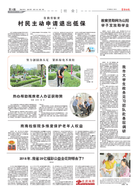 商洛日報(bào)社扎實(shí)履行社會責(zé)任,認(rèn)真做好民生報(bào)道,關(guān)注尊重社會弱勢群體,不斷反映群眾意愿和呼聲。災(zāi)難事故報(bào)道中,充分體現(xiàn)關(guān)愛生命,以人為本,尊重隱私,關(guān)注人的全面發(fā)展,尤其在脫貧攻堅(jiān)方面,不斷強(qiáng)化政治擔(dān)當(dāng),認(rèn)真落實(shí)包扶責(zé)任。年初,結(jié)合荊家河村實(shí)際,組織包扶干部入戶,制定了單位年度包村扶貧計(jì)劃,進(jìn)一步明確了年度幫扶目標(biāo)任務(wù)。先后幫助荊家河村制定完善了學(xué)習(xí)、工作會議、文件檔案管理、群眾接待辦事服務(wù)和財(cái)務(wù)后勤五項(xiàng)管理制度,并印發(fā)30冊,發(fā)放到了四支隊(duì)伍及各村民小組長手中。督促指導(dǎo)村上新建起了愛心超市,落實(shí)了集體經(jīng)濟(jì)百畝杏園承包管護(hù)工作,目前經(jīng)濟(jì)效益初顯。協(xié)助村上完成了辦公樓擴(kuò)建主體工程和狗皮溝一華里通組道路主體硬化。組織開展扶志扶智活動,對2018年評選的4個(gè)脫貧標(biāo)兵和16戶“十星級文明戶”的先進(jìn)事跡進(jìn)行了展板宣傳,積極弘揚(yáng)他們的脫貧經(jīng)驗(yàn),在全村營造出學(xué)標(biāo)兵、當(dāng)模范、爭脫貧的濃厚氛圍。持續(xù)做好新聞宣傳扶貧,先后撰寫了《試馬鎮(zhèn)--這里的敬老院溫暖如春》《助老扶老是打贏脫貧攻堅(jiān)戰(zhàn),提高扶貧滿意度的關(guān)鍵》《試馬鎮(zhèn)50名農(nóng)民工 接受焊工技能培訓(xùn)》等文章,在報(bào)紙及網(wǎng)站發(fā)表,社會反應(yīng)良好。6月份,組織了荊家河村扶志扶智培訓(xùn)會及文藝匯演,通過宣傳脫貧政策和勵志演出,進(jìn)一步增強(qiáng)貧困戶的政策知曉率和脫貧能力。舉辦了公文處理及新聞業(yè)務(wù)培訓(xùn)班,使全鎮(zhèn)40多名年輕鎮(zhèn)村干部不僅學(xué)到了業(yè)務(wù)知識、增長了才干,而且開闊了視野、提振了信心。