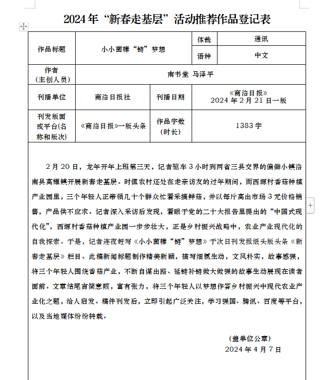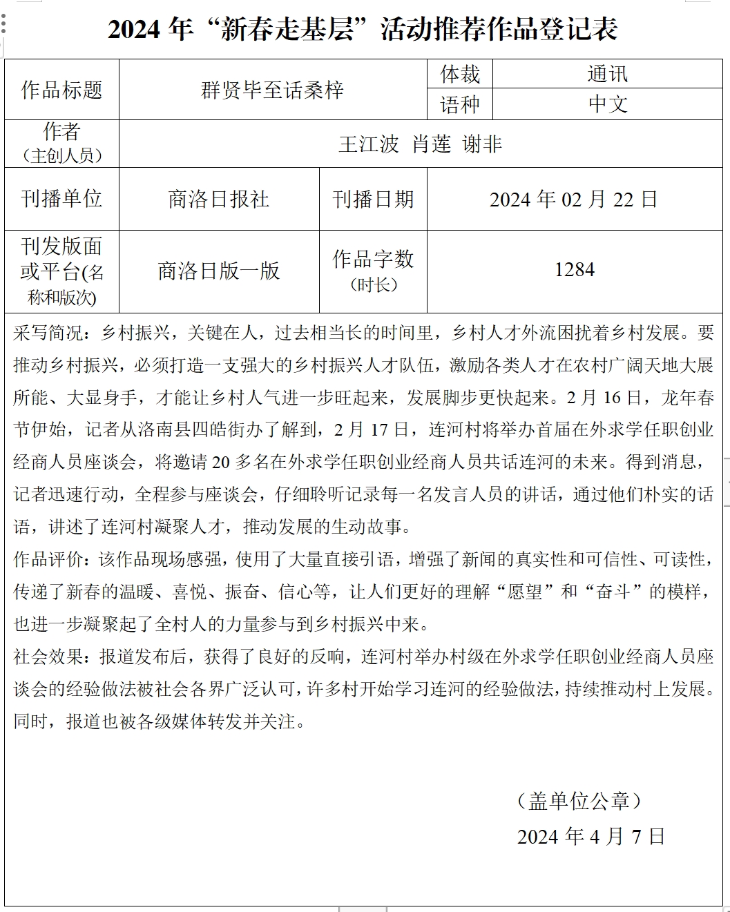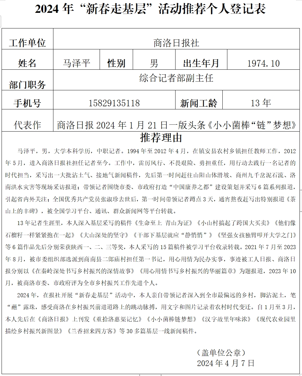 根據(jù)陜西省委宣傳部《關(guān)于推薦2024年“新春走基層”活動(dòng)先進(jìn)集體、先進(jìn)個(gè)人和優(yōu)秀作品的通知》文件精神以及市記協(xié)相關(guān)工作要求,對(duì)擬選送的先進(jìn)集體、先進(jìn)個(gè)人和優(yōu)秀作品進(jìn)行了評(píng)選?,F(xiàn)將評(píng)選結(jié)果公示如下,公示時(shí)間為2024年4月7日至2024年4月11日。若對(duì)公示對(duì)象有異議的,可在公示期內(nèi)向總編辦反映。