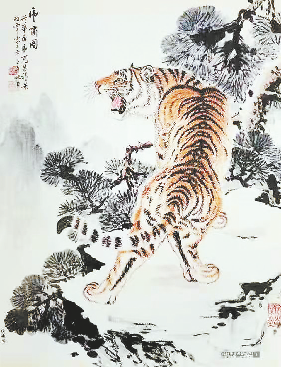 正氣、生氣、勇氣、骨氣、清氣、文氣,合起來就是英雄氣、君子氣,有王者氣象而內(nèi)懷仁慈之心,勇于進(jìn)取而無自私貪婪之兇殘,瀟灑有度而無偏狹狂妄之失態(tài),威嚴(yán)自尊而不失親和力與感召力。畫筆傳精神,美圖顯愛憎,虎之精神亦人之精神也。