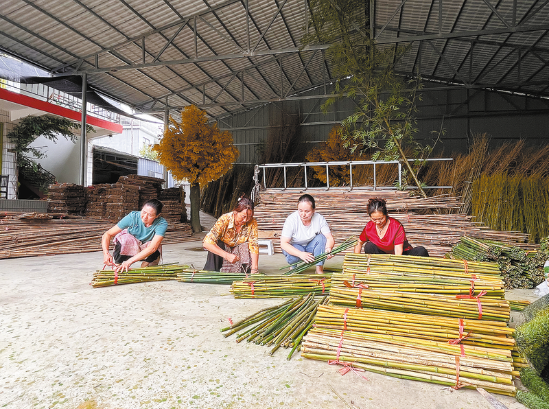 “我每天早上7點來到這里上班,中午11點回家為孩子準(zhǔn)備飯菜,時間相對自由,一天能賺80多塊錢。”正在往竹莖上粘貼仿真竹葉的村民操建紅談及家門口的工作,感到非常滿意。