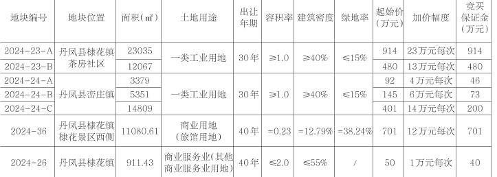 四、本次拍賣出讓的詳細資料和具體要求,見拍賣出讓文件。申請人可于2024年12月23日至2025年1月11日到丹鳳縣自然資源局一樓(丹鳳縣土地收購儲備中心)獲取出讓文件。