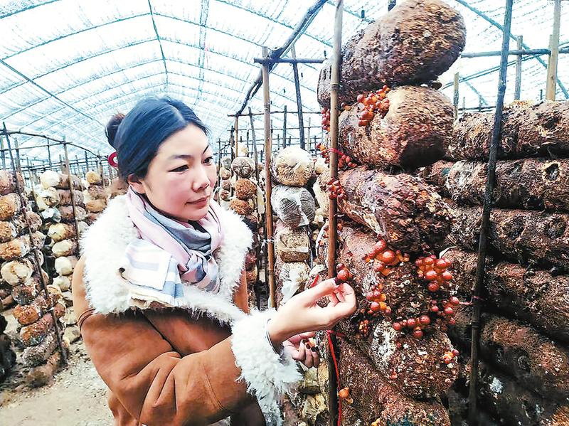 王婷檢查滑子菇長(zhǎng)勢(shì)