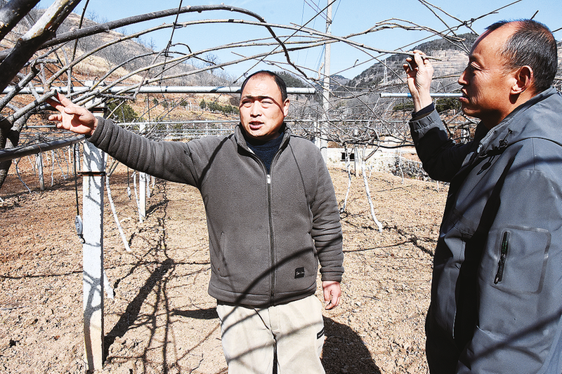許昆鵬(左)察看獼猴桃樹的生長情況