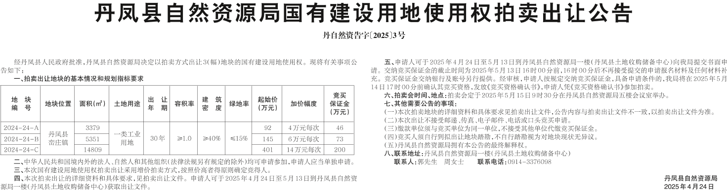 丹鳳縣自然資源局國(guó)有建設(shè)用地使用權(quán)拍賣出讓公告