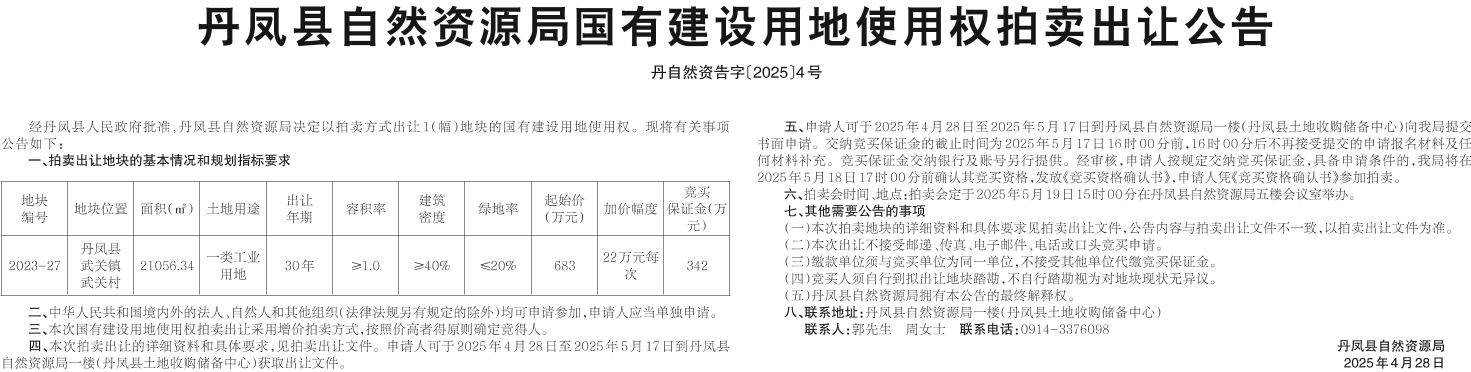 丹鳳縣自然資源局國有建設(shè)用地使用權(quán)拍賣出讓公告