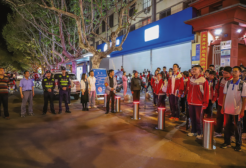 4月20日21時,在丹鳳縣初級中學(xué)校門口,一排銀灰色金屬柱準(zhǔn)時升起,移動紅綠燈有序疏導(dǎo)車流,閃爍的警燈格外醒目,身著制服的公安民警與佩戴紅袖章的學(xué)生家長來回巡查,護送學(xué)生安全有序出校。