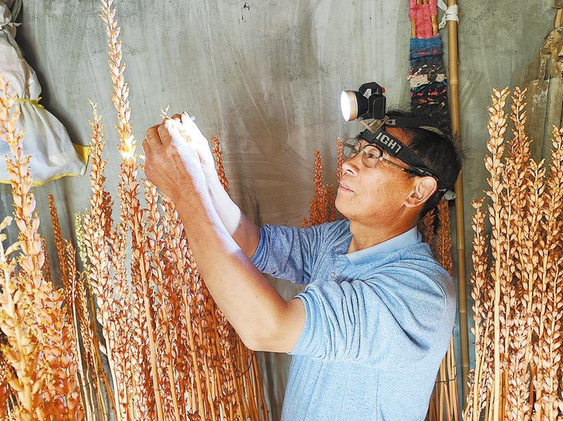 種植大戶周中啟在為天麻進(jìn)行人工授粉