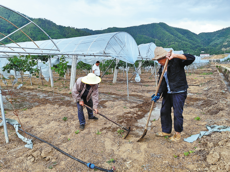 連日來,丹鳳縣土門鎮(zhèn)土門村組織群眾引水澆灌葡萄園。為做好糧食安全和水雜果園區(qū)抗旱管理,鎮(zhèn)上對產(chǎn)業(yè)園區(qū)采用“一園區(qū)一抗旱”方案,利用原有噴灌、滴灌設(shè)施有效保障土門糧食種植示范田、獼猴桃基地、葡萄基地、長沙溝口村葡萄基地和大棚以及七星溝村大棚、八十河村糧食種植示范田灌溉用水。(本報記者 賈書章 攝)