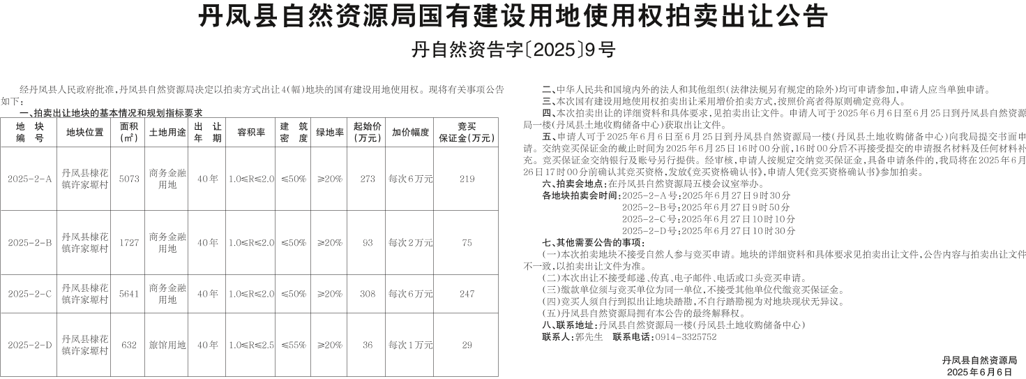 丹鳳縣自然資源局國有建設用地使用權拍賣出讓公告