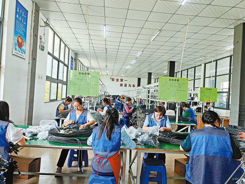 6月4日,丹鳳縣竹林關(guān)鎮(zhèn)社區(qū)工廠萬朋輝電子廠生產(chǎn)車間內(nèi),50余名工人正在有條不紊地加工數(shù)據(jù)線。據(jù)了解,該廠采用“廠內(nèi)用工+外包加工”的形式,就地就近吸納近300名勞動力就業(yè),計劃今年擴大生產(chǎn)規(guī)模,新增20條生產(chǎn)線,更好地促進當(dāng)?shù)厝罕娋蜆I(yè)增收。 (本報通訊員 王 蒙 攝)