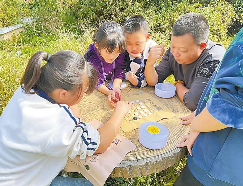 王曉勇(右一)和研學(xué)實踐的孩子們下農(nóng)閑棋“狼吃娃”