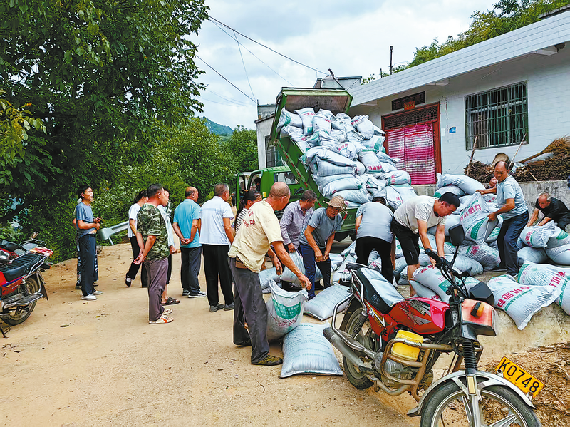 近日,丹鳳縣竹林關(guān)鎮(zhèn)孤山坪村黨支部聯(lián)系上級部門爭取到100多噸化肥,在村委會的統(tǒng)籌下,化肥免費發(fā)放至全村578戶群眾手中,有效保障秋播生產(chǎn)。 (本報通訊員 陳 庚 攝)