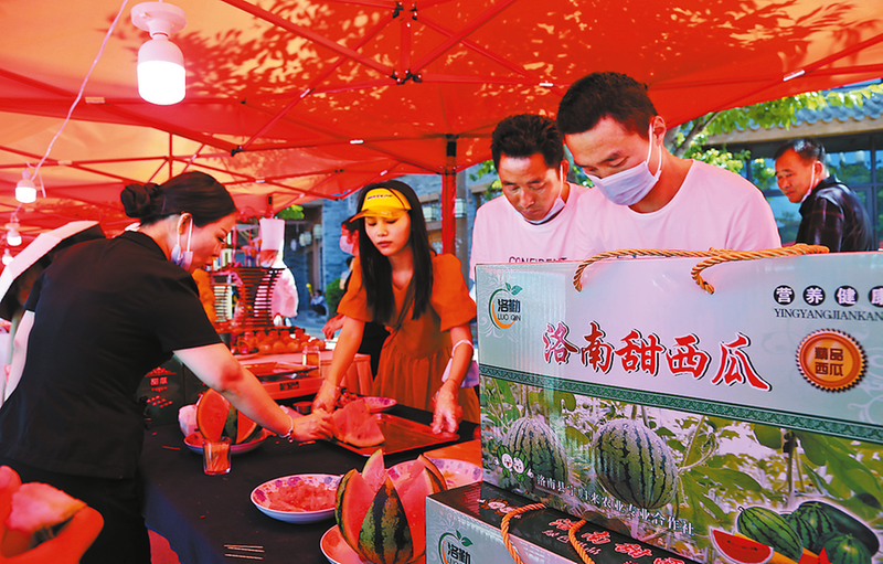 和“旱改水”水稻一樣走紅網(wǎng)絡(luò)的還有洛南引進(jìn)的橫溪小西瓜,這個(gè)產(chǎn)業(yè)的發(fā)展始于南京綠橋瓜果菜專業(yè)合作社的理事長王宏山,在江寧區(qū)對口幫扶洛南縣聯(lián)絡(luò)組的牽線下,綠橋瓜果菜專業(yè)合作社出資在洛南縣古城鎮(zhèn)中聯(lián)村建立了優(yōu)質(zhì)瓜果菜種植示范推廣基地,協(xié)助當(dāng)?shù)毓限r(nóng)李江洪成立了洛南縣寧農(nóng)瓜果蔬菜專業(yè)合作社,吸納30多戶瓜農(nóng),重點(diǎn)引種江寧名瓜——橫溪小西瓜,建立了江蘇農(nóng)村科技服務(wù)超市洛南便利店,由王宏山擔(dān)任技術(shù)顧問,駐守西瓜基地為廣大瓜農(nóng)手把手地傳授農(nóng)業(yè)科技知識。2020年試種的50畝橫溪小西瓜喜獲成功,當(dāng)年收益75萬元。此后,吸引寧歸來合作社主動加盟,種植規(guī)模不斷擴(kuò)大,僅中聯(lián)村就流轉(zhuǎn)土地500畝,新建大棚240個(gè),村集體經(jīng)濟(jì)年增加收入10多萬元。在江寧區(qū)對口幫扶洛南縣聯(lián)絡(luò)組的扶持下,橫溪小西瓜的種植規(guī)模已躍升至1000畝,累計(jì)投入蘇陜協(xié)作資金620萬元,新建以橫溪小西瓜、五色圣女果、羊角蜜瓜、草莓等果蔬品種為主的種植、采摘、銷售于一體的寧農(nóng)瓜果蔬菜產(chǎn)業(yè)示范園,實(shí)現(xiàn)年產(chǎn)值2000多萬元,帶動周邊200多名群眾就近務(wù)工。不僅讓西部地區(qū)更多人吃上了帶有秦嶺氣質(zhì)的橫溪西瓜,返銷南京后也取得了“引自橫溪甜于橫溪”的效果,王宏山也堅(jiān)定了發(fā)展萬畝瓜菜產(chǎn)業(yè)的決心,要讓橫溪西瓜“田”滿洛南、甜遍洛南。