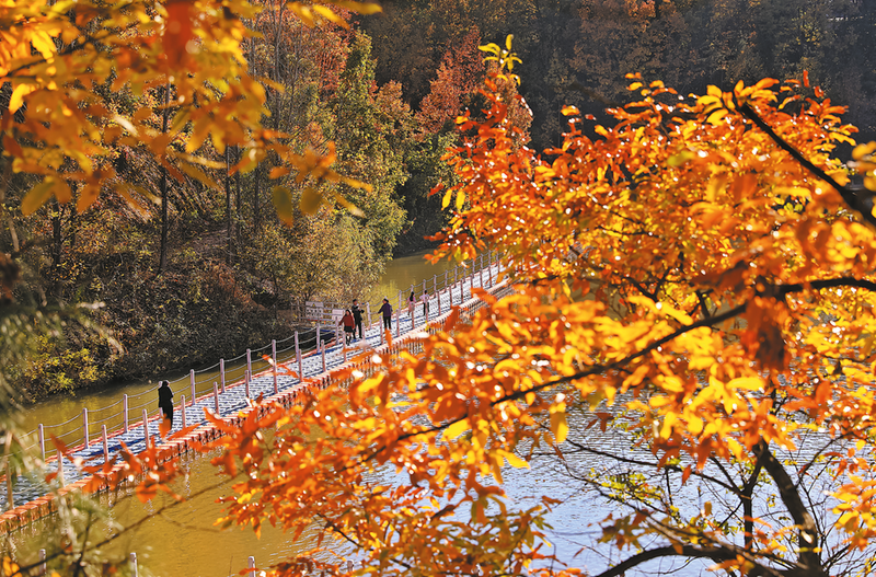 11月2日,位于洛南縣四皓街道的撫龍湖,山間樹葉呈現出金黃與火紅的斑斕色彩,碧綠的撫龍湖水與明凈的藍天遙相呼應,景色宜人,吸引游客前來拍照打卡,體驗扶龍湖迷人的秋色。 (本報通訊員 陳亞民 攝)