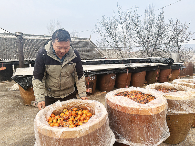 “每年霜降過后,將收購的柿子倒入大缸中密封,使其自然脫澀、發(fā)酵變甜、軟化出汁,待來年清明前后,過濾出柿子汁進(jìn)行酒精發(fā)酵,一周后酒精發(fā)酵完全后,加入醋曲封缸,再經(jīng)日曬夜露自然發(fā)酵成醋,麥?zhǔn)涨昂箝_缸出醋,此時(shí)醋汁清如水、亮如油,再經(jīng)過陳釀、過濾、滅菌、裝罐,就可以銷售了。”說起柿子酒的制作,王春敏駕輕就熟。