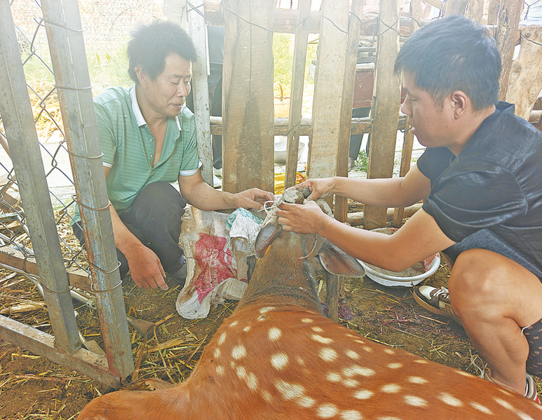 “再有半個(gè)月母鹿就要生產(chǎn)了,接生時(shí)一定要注意觀察……”6月11日中午,在洛南縣景村鎮(zhèn)景豐村董建良家的院子里,張朋濤在幫其割鹿茸后準(zhǔn)備返程,臨行前,他反復(fù)叮囑。