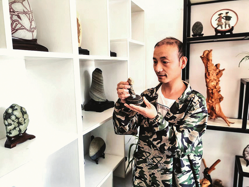 宋偉的房前屋后也成了“奇石收藏館”,室內(nèi)陳列著大大小小、形態(tài)各異的石頭,黃蠟石、蛤蟆豆、長江紅碧玉、文字石、圖案石等擺件應(yīng)有盡有,琳瑯滿目,讓人眼花繚亂。因?yàn)樗蝹釔凼占兲烊皇^,并鉆研石頭手工藝制作,既成就了自己也幫助了別人。在宋偉的幫助下,許多本地、外地愛好者通過抖音短視頻聯(lián)系上他。從2017年到現(xiàn)在,先后10多人向宋偉拜師學(xué)藝,也都紛紛靠著石頭走上了發(fā)家致富的道路。