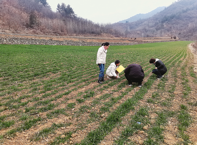 2月13日上午,農(nóng)技人員在麥田里查看麥苗長勢、土壤墑情。