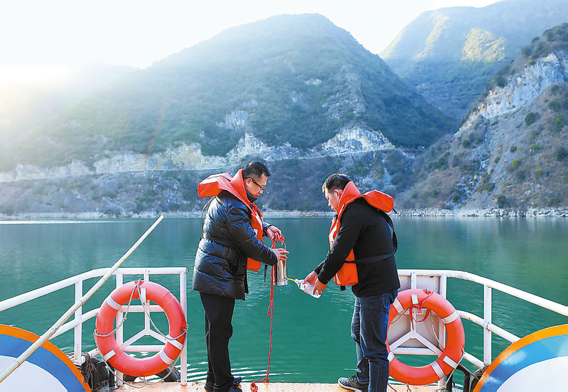 李泉(左)和同事在蓮花臺水庫進(jìn)行水質(zhì)采樣